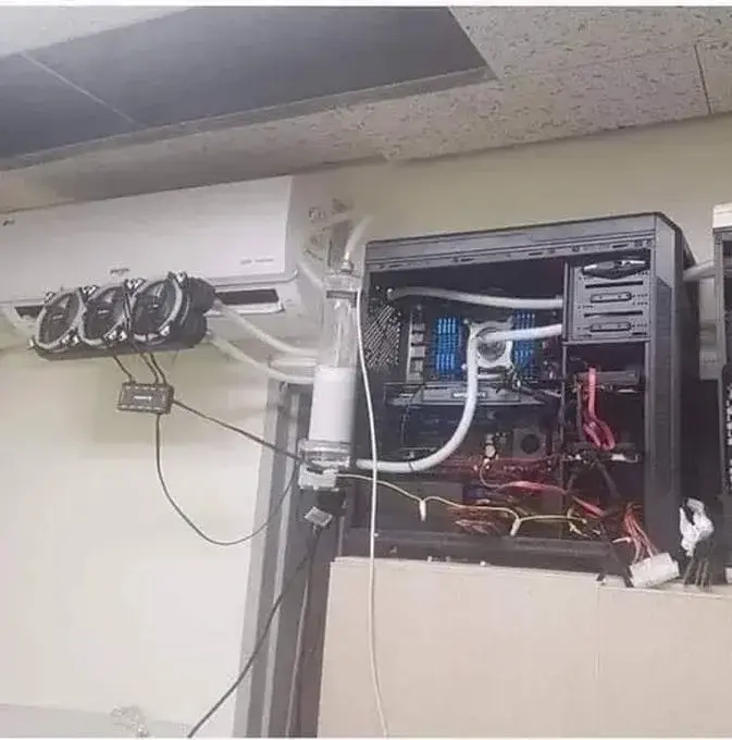 They’re hanging a water cooling radiator in front of an AC.